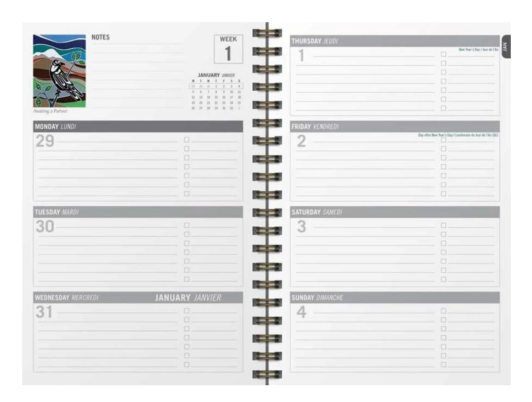 Our 12 month weekly planners include 2026-2027 calendars, 128 coloured pages, and 6 full page images. They are printed on FSC certified premium quality fine art paper, and are metallic coil bound and packaged in a protective sleeve. The artist's photo and biography are on the back of each weekly planner. The finished size is 6"x 9" when closed and 12" x 9" when opened. They are designed, printed, and proudly made in Canada.